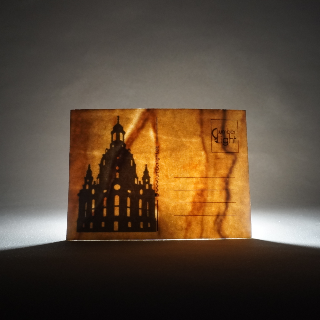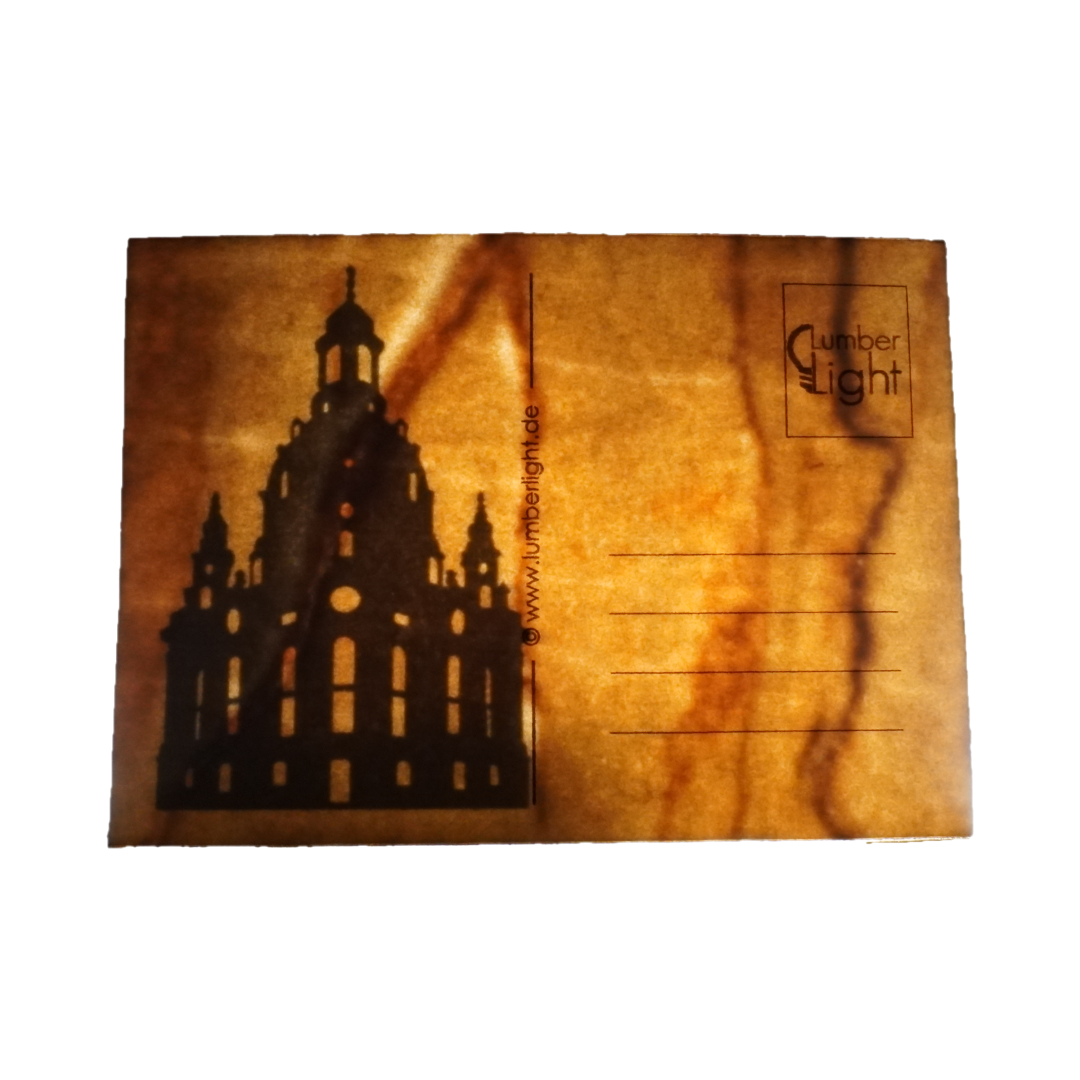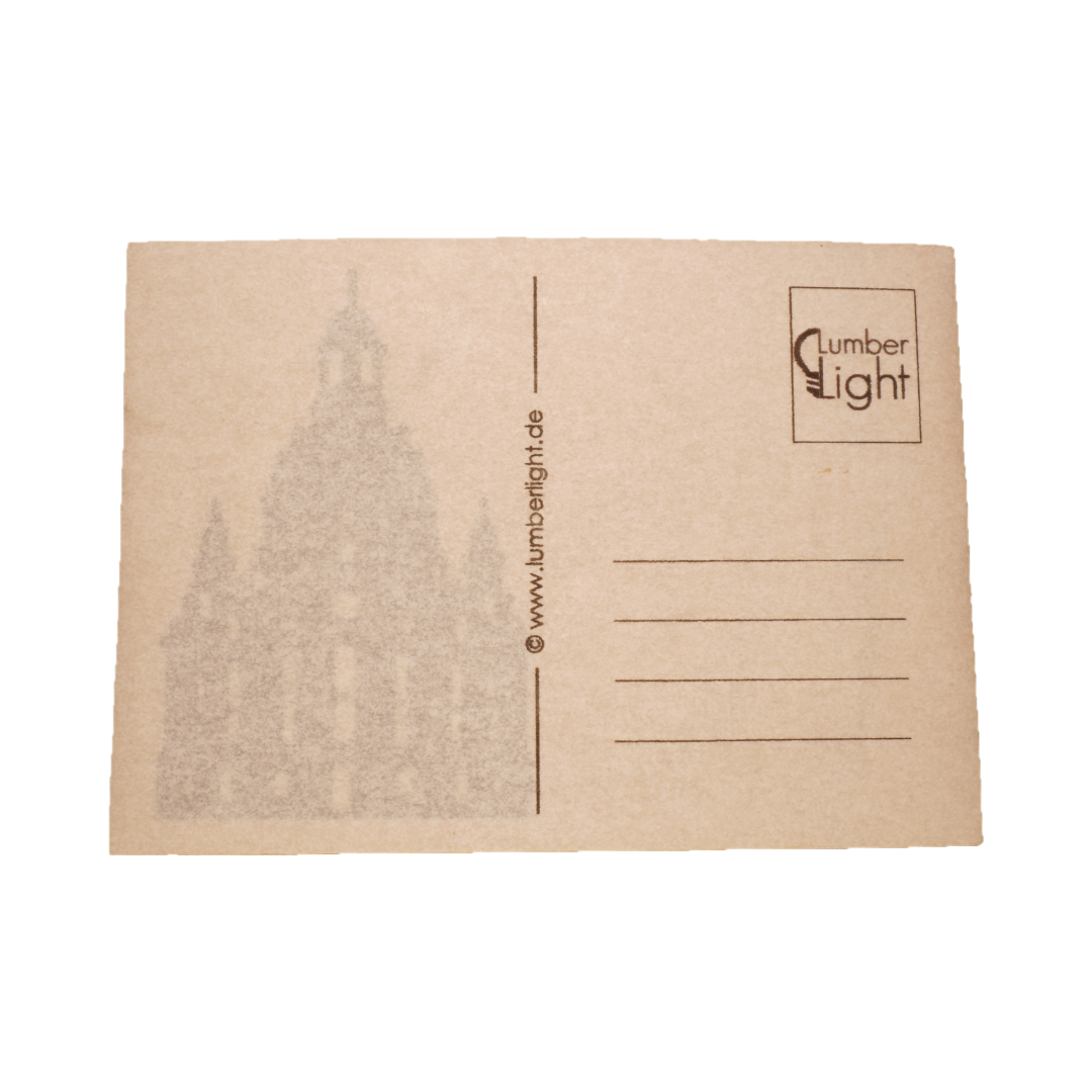 Die Postkarte aus echtem sächsischen Sandstein ist das etwas andere Souvenir aus unserer Heimat Sachsen. Die Postkarte ist nur 2 bis 3 mm dünn. Hält man die Karte gegen das Licht, so wird der echte, schwere Stein zu einem Transparent, sodass die Silhouette der Frauenkirche Dresden durch die einzigartige Struktur des Sandsteins scheint. Diese Wirkung kann durch Kerzen- oder direktes Licht verstärkt werden. Der Sandstein wurde mit einer speziellen Technik versiegelt und lässt sich unbedenklich mit einem feuchten Tuch abwischen, ohne zu „sanden“.